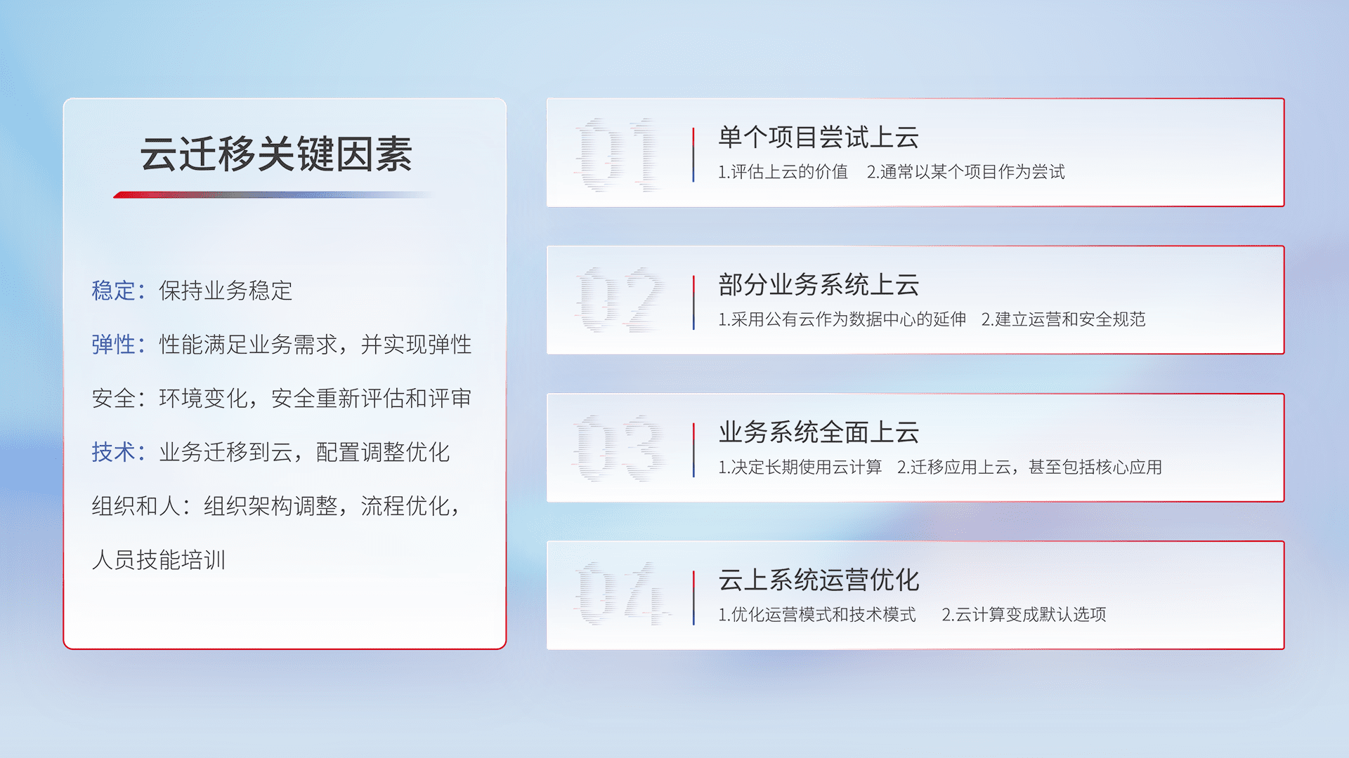 结合实际业务,,,,从规划设计、、云平台选型、、、云原生改造、、数据迁移、、、集成交付,,,迁移全过程为客户识别最佳上云路径,,,做好风险识别管理,,设计网络架构、、、身份权限、、、安全审计合规、、、、操作审计、、、日志审计、、、监控告警策略、、、多站点容灾设计等,,,,对云上基础设施进行整体规划,,,提升IT治理水平,,,,以满足弹性、、、高可用、、、高性能的需求。。。
