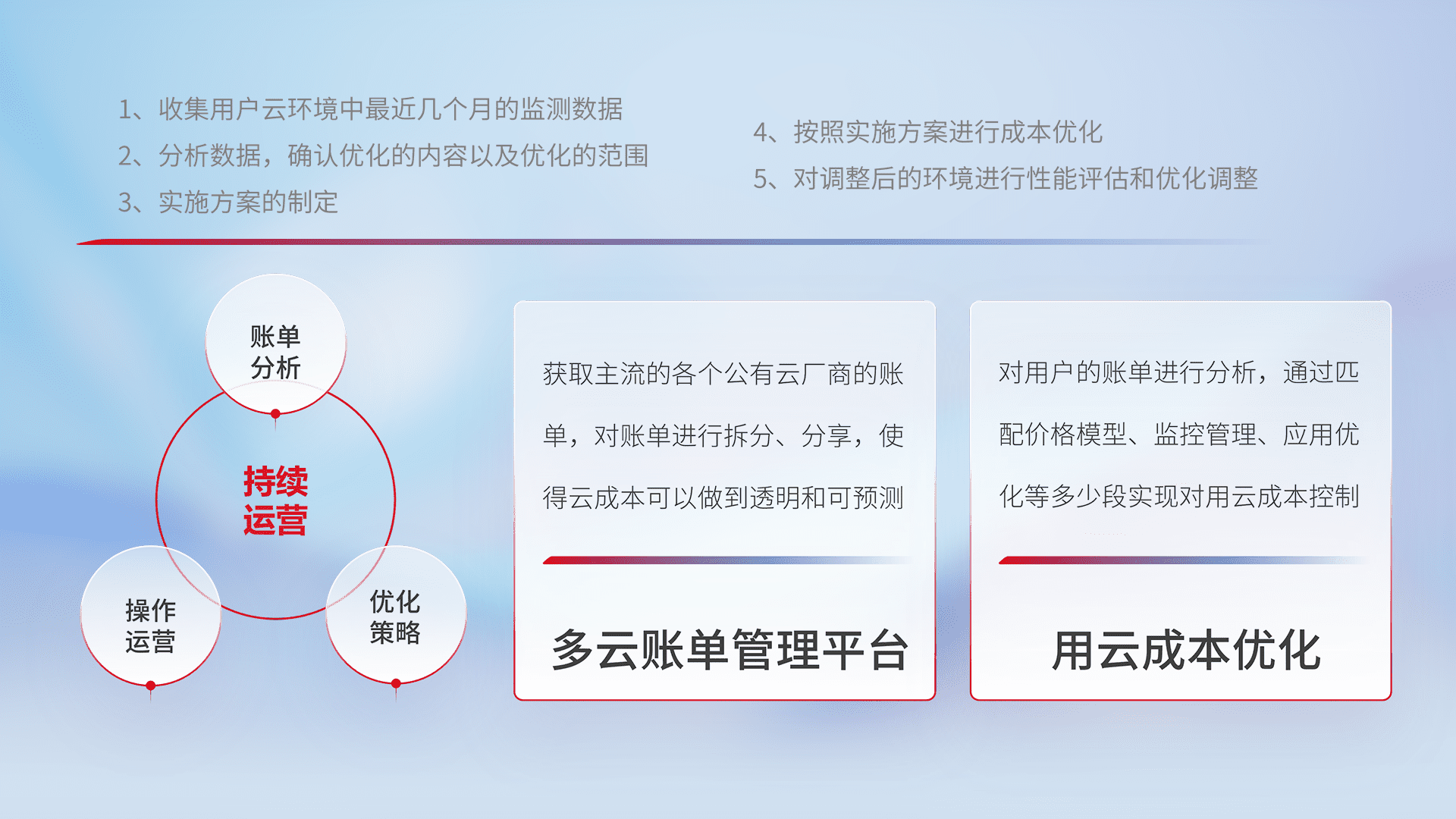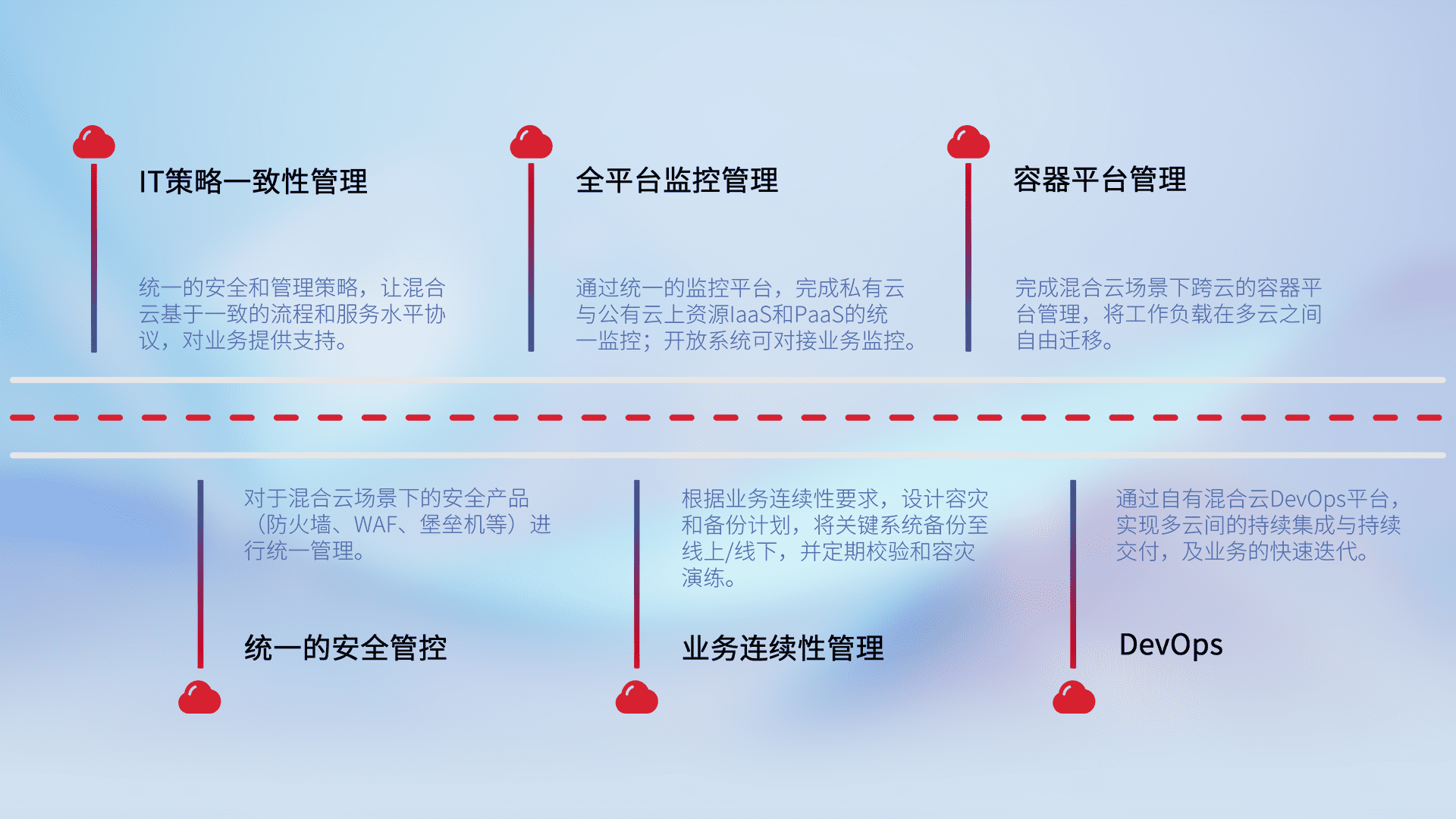 通过多云纳管,,,以统一的资源数据模型把客户的云资源进行抽象和封装,,,进而实现对多云资源的统一操作,,,,保障云资源管理的可靠性、、、、稳定性与可用性。。。量身定制化运维内容,,,,配置、、、开发运维、、、、补丁管理、、、、备份、、监控、、、、认证和访问管理、、、审计和日常巡检等,,保障在用云过程中的可靠度,,,,稳定度以及高可用率。。。。